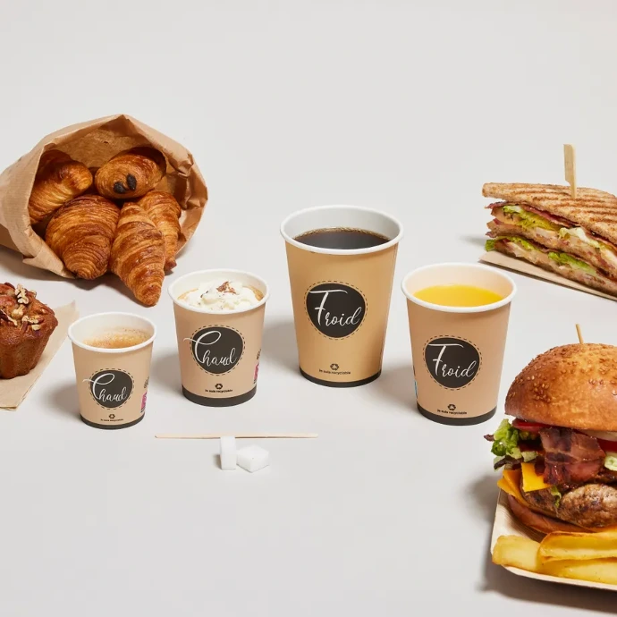 Optez pour nos gobelets en carton personnalisés, disponibles en 120, 180, 250 et 350 ml, pour valoriser votre image de marque.